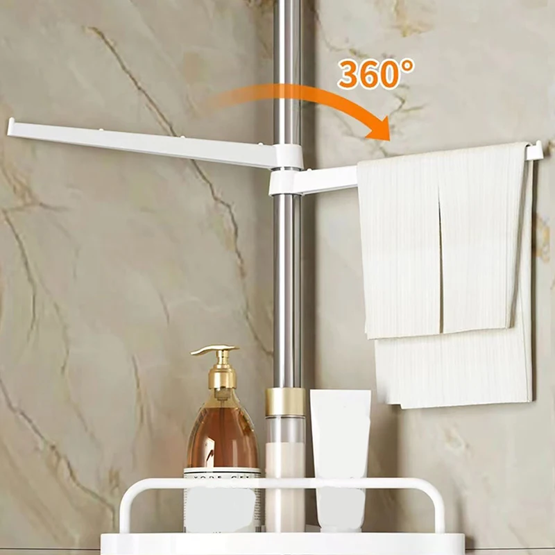 Les 5 étagères avec système de drainage automatique gardent vos produits au sec. Profitez également de 4 crochets multifonctions et d’un porte-serviettes intégré. Son système de rotation à 360° permet un accès rapide à tous vos produits.